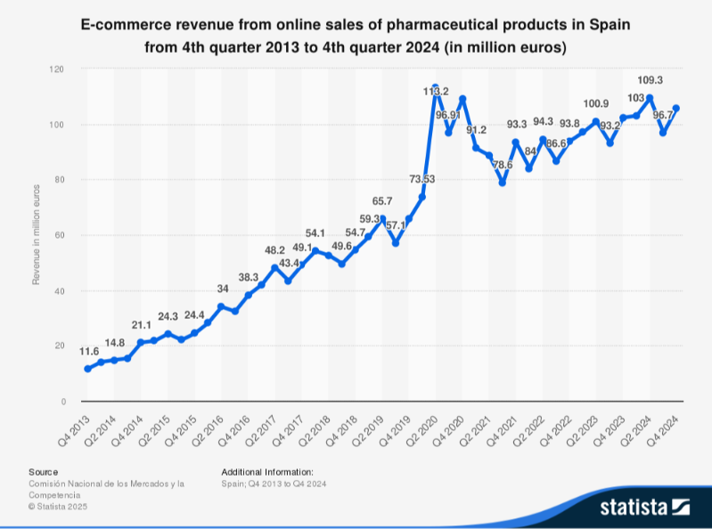 En el último trimestre del año 2024 se registraron unas ganancias de 105,8 millones de euros solo en venta de productos farmacéuticos online. Esta cifra se quedó ligeramente por debajo de los datos obtenidos en el segundo trimestre del mismo año cuando se alcanzaron los 109,3 millones de euros solamente superados en el año 2020.