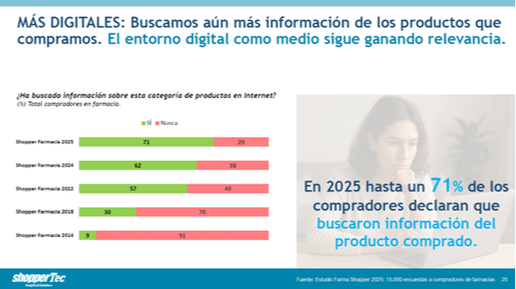 El comportamiento del shopper evoluciona de forma constante: influencias digitales, nuevas categorías emergentes, mayor sensibilidad al precio o a la sostenibilidad. En Farma Shopper 2025 vemos que 7 de cada 10 compradores buscan información en internet antes de decidir. Este tipo de cambios evidencian por qué contar con estudios actualizados es clave para construir estrategias de Trade sobre insights vigentes, y no sobre intuiciones del pasado.