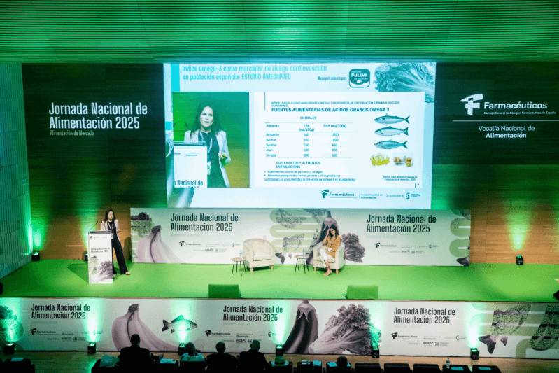 Antes, Estefanía Sánchez Rodríguez, del Centro de Investigación Biomédica en Red de Fisiopatología de la Obesidad y la Nutrición (CIBEROBN), del Instituto de Salud Carlos III, habló del Índice omega-3 como marcador de riesgo cardiovascular en población española y del Estudio OMEGAPRED. Comentó que existen en el mercado alimentos enriquecidos, que contribuyen a aumentar los ácidos grasos omega-3 en el organismo. Al menos, debemos tomar 250 mg al día. En embarazo y lactancia, se recomienda 100-200 mg de DHA, evitando, eso sí, pescados grandes. Se consigue tomando más de dos raciones de pescado a la semana. Una ha de ser pescado azul. Los omega-3 representan beneficios de salud cardiometabólica. Hay efectos beneficios en enfermedades con base inflamatoria.